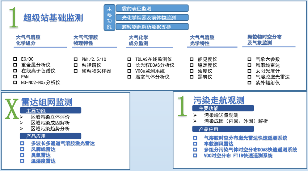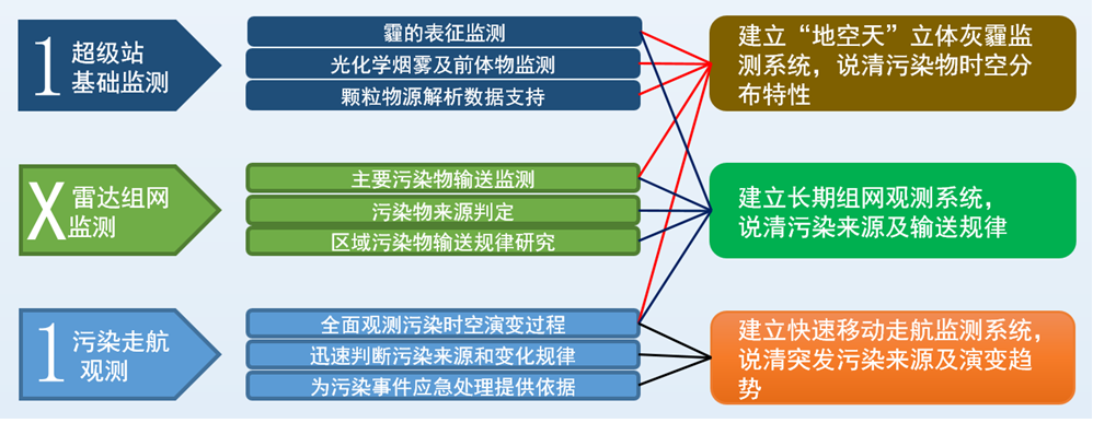 方案采用超級站基礎(chǔ)監(jiān)測平臺(灰霾物化特性監(jiān)測)、雷達(dá)組網(wǎng)監(jiān)測平臺和污染走航觀測平臺(簡稱“1+X+1”)的應(yīng)用模式,并結(jié)合外源(衛(wèi)星)數(shù)據(jù)分析,綜合解決以上問題。主要解決城市灰霾污染分析體系建設(shè)、區(qū)域污染傳輸影響以及污染來源分析問題,為顆粒物源解析、區(qū)域污染預(yù) 警預(yù)報(bào)提供數(shù)據(jù)支撐。