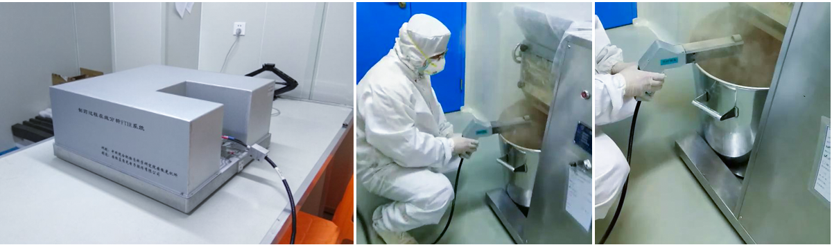 儀器由動(dòng)態(tài)自準(zhǔn)直近紅外傅立葉紅外反射儀、光纖探頭、近紅外數(shù)據(jù)庫(kù)和制藥過(guò)程參數(shù)定量分析模型構(gòu)成,紅外光源發(fā)出的光經(jīng)過(guò)準(zhǔn)直后,進(jìn)入干涉儀中形成相干光,將光耦合進(jìn)光纖,使用光纖探頭照射并采集含有藥品成分信息的光信號(hào),并將光信號(hào)返回到光譜儀中,由探測(cè)器收集干涉信號(hào),經(jīng)過(guò)傅立葉逆變換后得到含有藥品成分信息的近紅外光譜信號(hào)。紅外光與物質(zhì)的相互作用包括:吸收、全反射、漫反射、透射、散射。針對(duì)固體藥品無(wú)損檢測(cè),光纖探頭采用照射到樣品后樣品的漫反射光作為分析光束。漫反射光耦合至檢測(cè)光纖,再通過(guò)檢測(cè)光纖傳導(dǎo)至紅外光譜儀的探測(cè)器,最后經(jīng)過(guò)紅外光譜儀的數(shù)據(jù)處理系統(tǒng)處理成紅外光譜。針對(duì)制藥過(guò)程在線(xiàn)監(jiān)測(cè),在送料通道上安裝旁路監(jiān)測(cè)系統(tǒng),結(jié)合近紅外光纖耦合技術(shù),實(shí)現(xiàn)藥品原料參數(shù)的快速測(cè)量,并根據(jù)分析算法,實(shí)現(xiàn)生產(chǎn)過(guò)程參數(shù)的快速評(píng)價(jià)。通過(guò)建立監(jiān)測(cè)送料口的藥物含水量、有效成分含量等變化情況與趨勢(shì),建立相應(yīng)數(shù)據(jù)庫(kù)為優(yōu)化工藝參數(shù)、入料時(shí)間與數(shù)量的決策,以及生產(chǎn)節(jié)點(diǎn)提供指導(dǎo)。