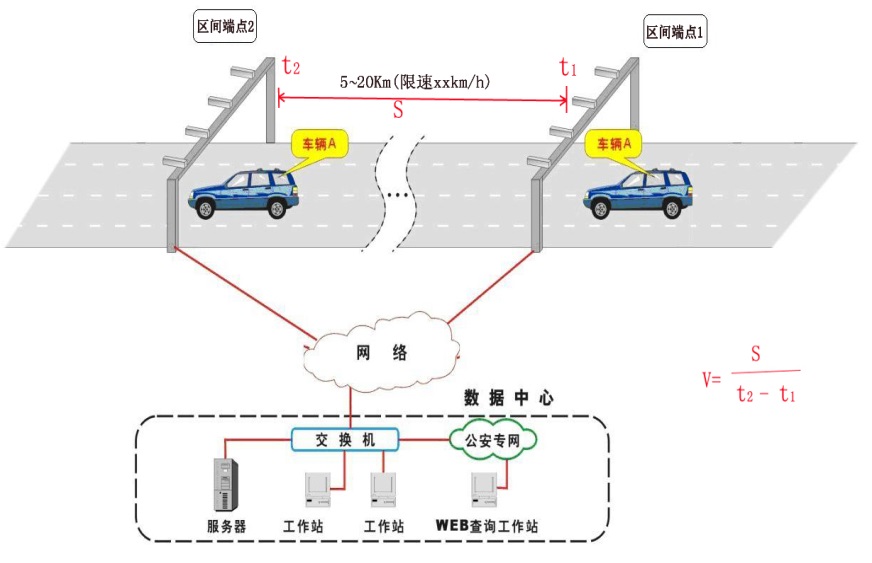 在一定距離(約5~20km)的封閉路段的兩端點上,安裝具有車牌識別功能的視頻檢測系統,當機動車通過兩個端點時,系統將自動記錄其通過該點的時間、車牌和瞬時速度,并對車輛特征圖片進行抓拍。系統在無人值守的情況下,測量并計算出車輛在道路上的瞬時速度和平均速度,據此判定是否超速。