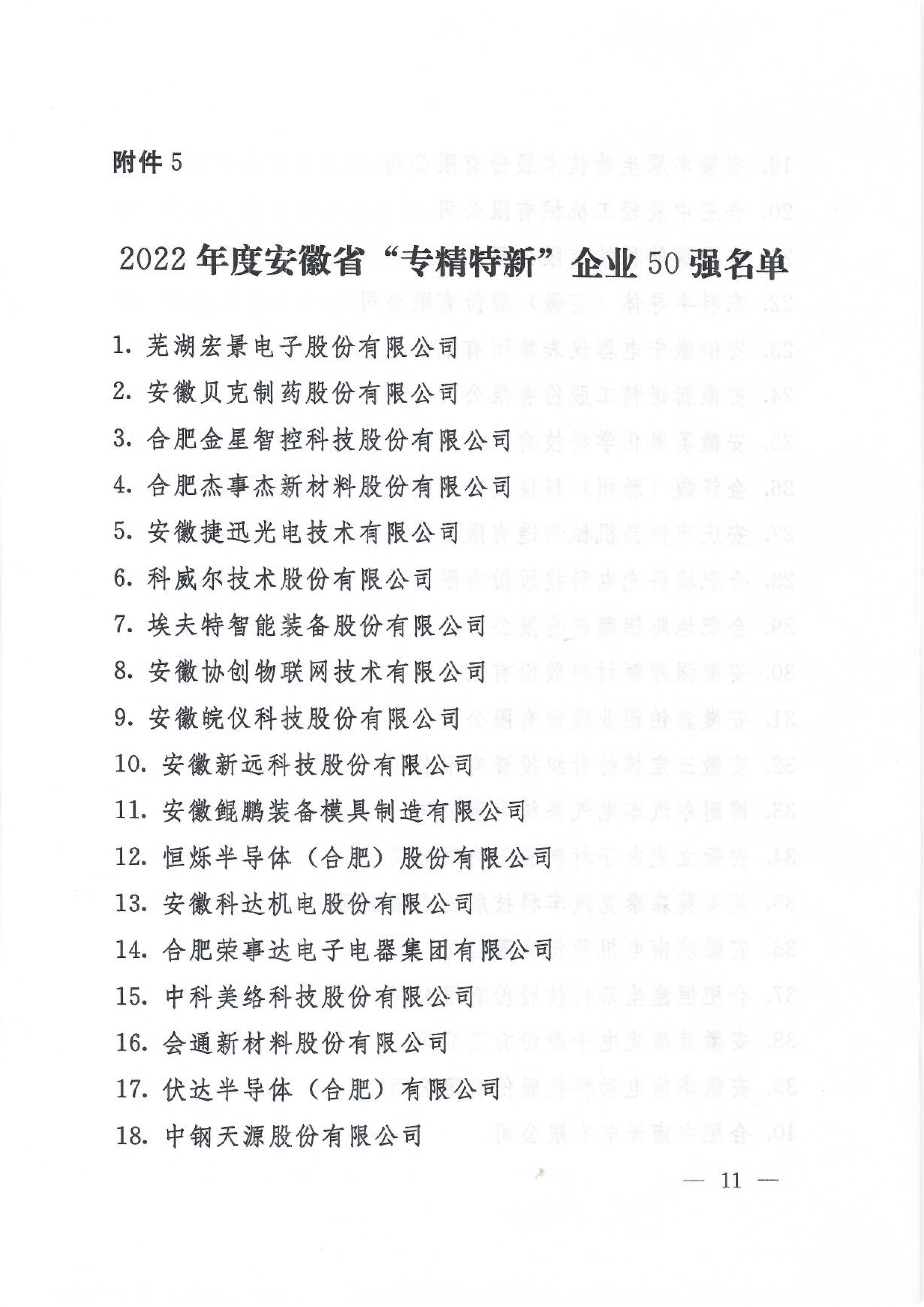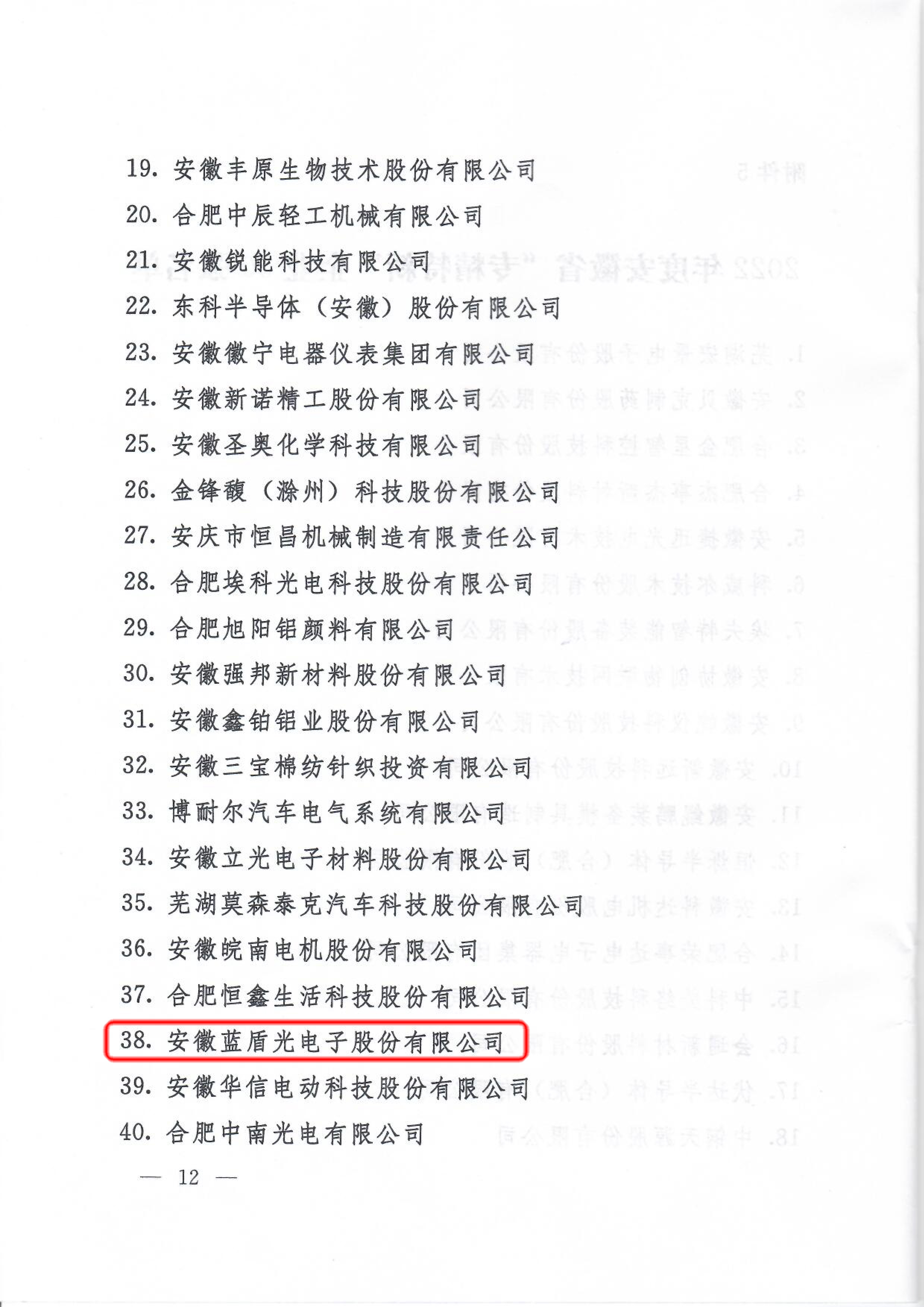2023年1月28日,中共安徽省委辦公廳、安徽省人民政府辦公廳公布關于《2022年度安徽省“專精特新”企業50強名單》。藍盾光電(股票代碼:300862)榮獲安徽省“專精特新”企業50強榮譽稱號!